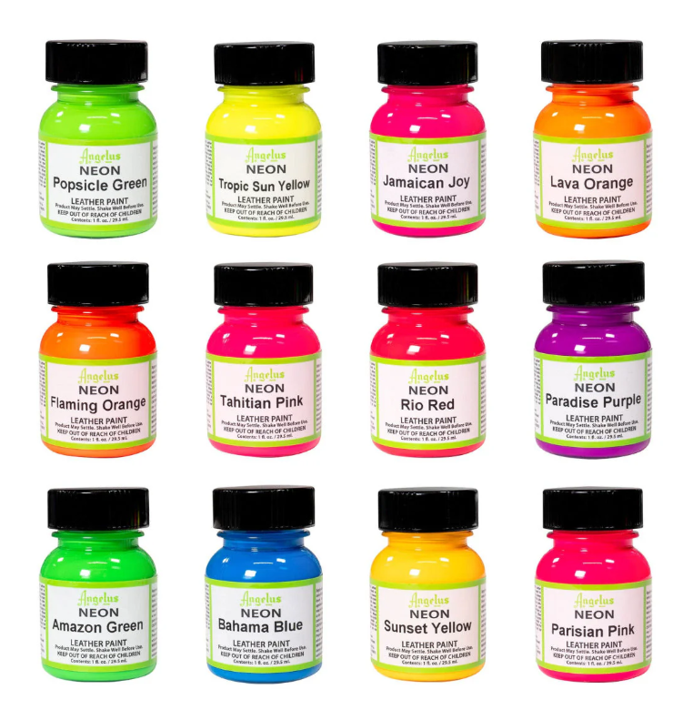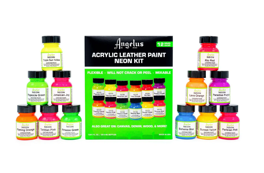 Набор неоновых красок Angelus – 12 цветов Добавьте яркости своим проектам с набором Angelus Neon Paint Kit. В комплект входят 12 неоновых красок для кожи (по 29,5 мл), идеально подходящих для кастомизации кроссовок, обуви и кожаных аксессуаров. Краски легко наносятся, остаются гибкими и обеспечивают долговечный профессиональный результат. Для лучшего эффекта подготовьте поверхность с помощью Angelus Preparer and Deglazer, наносите тонкими слоями и закрепите финишем. Идеально для кастом кроссовок, реставрации кожи и творческих проектов.